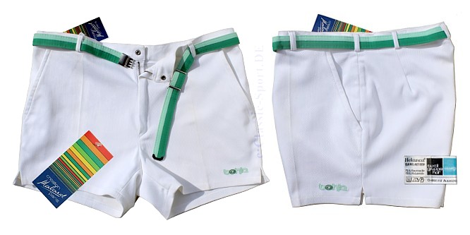 Bohle / Österreich (Malard / Paris) von ca. 1985 Eine klassische Tennishose von BOHLE / Österreich aus der Kollektion Malard Paris vom Anfang der Boris Becker Ära, aus leicht elastischem Helanca-Querelastic = 75% Baumwolle : 25% Polyamid, ein oft verarbeitetes Material der damaligen Sportkollektionen. Mit Druckknopf, Metallzip und Gürtel mit Clip. Zwei Seitentaschen keine Popotasche. Kleine Seitenschlitze für optimale Beinfreiheit. Noch nie getragen und praktisch immernoch neu mit Etikett! Beim Nachmessen bitte beachten, dass der Bund selber nicht dehnbar ist. Die alten Grössen fallen nach heutigen Masstäben sehr knapp aus! Die blauen Vergleichs-Grössen sind zutreffender!