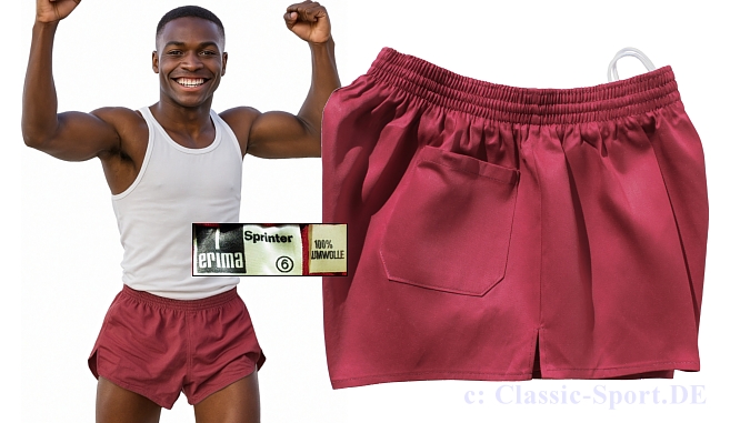 ERIMA Sprinter aus 100% Baumwolle, vor 1976 Eine originale ERIMA "Sprinter" aus 100% Baumwolle in Weinrot / Bordeaux. Hergestellt in WestGermany vor 1976 (Erima = Erich Mak in Reutlingen, gegründet im Jahre 1900, von 1936-76 der Erstausstatter der deutschen Nationalmannschaften bei EM, WM und Olympia, danach unter Adidas) Original ohne Innenhose und aus jenem Baumwollstoff gemacht, der nach dem Waschen ganz weich wird und beim Tragen die typischen Falten aufwirft. Mit 3-fach Bundgummi und aufgesetzter Popotasche. Kein zusätzlicher Kordelzug. Seitlich geschlitzt für bessere Beinfreiheit. Immernoch nagelneu und in Bestzustand! Diese Erima-Grösse 6 fällt etwas reichlicher aus als wie bei den Adi-Dassler’s aus gleicher Zeit. Bitte vergleichen Sie Ihre Idealweite mit meinen nachgemessenen Angaben! Diese Sprinterhose wurde früher recht eng getragen. Wenn Sie zeitgemäss bleiben wollen, sollten Sie nicht mehr als 5-7cm im Bund lassen. Die in Blau gedruckten Werte sind in etwa heute gängige Vergleichsgrössen.