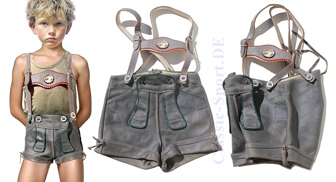 original 60er Jahre, Gotha in Thüringen, mit viel Patina... Eine klassisch kurze Jungs-Lederhose aus der DDR der 60er Jahre. Der Hersteller ist nicht erkennbar aber in Stil und Ausführung könnte sie von der PGH Lederbekleidung in Gotha / Thüringen sein. Genäht aus robustem Rind-Spaltleder, innen rauh und aussen ziemlich speckig und glatt gewetzt. Taschenfutter aus Leinewand. Mit Knopflatz und Plastikknöpfen. Der originale Träger mit einem kleinen Geldtäschlein via Messingzip. Keine Popotasche und auch keine Messertasche. Viel getragen aber immernoch top erhalten und mit Lederbalsam weich gepflegt. In der rechten Tasche hab’ ich noch einen DDR-Groschen von 1967 gefunden. Den lass’ ich drinnen. Bei der DEFA finden Sie unter YT einen passenden Film über einen kleinen DDR-Rabauken, der so ne Ledehose trägt: “Philipp der Kleine“… Bitte vergleichen Sie die Idealgrösse Ihres Rabauken mit den ausgemessenen Angaben! Die in Blau gedruckten Werte sind in etwa gängige Vergleichsgrössen von Heute. Mein Modelljunge hat ne 134...