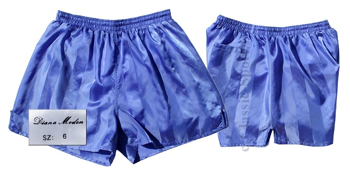 orig. 80er Diana-Moden "Chile" Eine klassisch kurze und noch nie getragene „Diana-Moden“ Sporthose aus einem weichen Polyamid / Nylon in Blau und mit den vertikal abwechselnd glänzenden und matten Strukturstreifen im Stoff. Bei Adidas vor 40 Jahren unter „Chile-Schattenstreifen“ bekannt. Genäht in China, wohl für einen österreich. Importeur. Mit dünner Innenhose aus Baumwolle in Weiss, breitem Band-Bundgummi, aufgesetzter Popotasche sowie mit extra Kordelzug im Bund. Seitlich geschlitzt für optimale Beinfreiheit. Im Schnitt nicht mehr so ganz kurz wie die bekannteren Adidas Beckenbauers. Stammt aus der Auflösung eines grossen süddeutschen Sporthauses welches nur teure Marken geführt hatte, also mit Sicherheit kein Billigkram. Immernoch neu und ungetragen! Bitte vergleichen Sie Ihre Idealgrösse mit den nachgemessenen Weiten! Die in Blau angegebenen Grössen sind zum Vergleich gedacht.