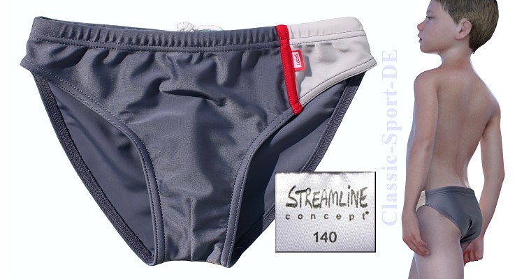 Streamline Concept, 80er / 90er Jahre Eine klassisch sehr knapper Sport-Schwimmer-Badeslip einer unbekannten Marke, laut Innenschnipselchen „Streamline-Concept“ aus einem elastischen Lycra (=PA-Elasthan). Wahrscheinlich noch aus den 80er/90er Jahren. In Grau mit Applikationen in Hellgrau und Rot. Noch nie getragen und in Bestzustand! Bitte vergleichen Sie Ihres Junior’s Idealgrösse mit den ausgemessenen Angaben! Die in Blau angegebenen Werte sind in etwa gängige Vergleichsgrössen.