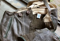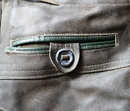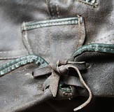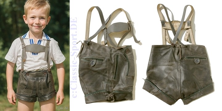 original 60er Jahre, Gössnitz in Sachsen, mit viel Patina... Eine klassisch kurze Jungs-Lederhose aus der DDR der 60er Jahre. Der Hersteller ist die PGH Lederbekleidung Gössnitz in Sachsen. Genäht aus weichem Rind-Spaltleder, innen rauh und aussen ziemlich speckig und glatt gewetzt. Taschenfutter aus Leinewand. Mit Knopflatz und (originalen) Plastikknöpfen. Der originale Träger mit Geldtäschlein. Das Edelweiss, wo da mal dran war, ist leider fort… Mit Popotasche und Messertasche an der Seite. Der Hosenboden extra verstärkt. Viel getragen aber immernoch top erhalten und mit Lederbalsam gepflegt. Bitte vergleichen Sie die Idealgrösse Ihres Rabauken mit den ausgemessenen Angaben! Die in Blau gedruckten Werte sind in etwa gängige Vergleichsgrössen von Heute. Mein Modelljunge hat ne 134, also ist noch a bissla Luft im Bund...