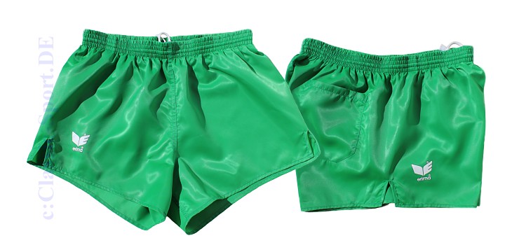 Erima Classic Glanz-Nylon Westgermany / 80er Jahre Eine klassisch kurze originale oldschool Glanzsport-oder Fussballhose von ERIMA = Erich Mak in Reutlingen, der Erstausstatter der deutschen Nationalmannschaften bei EM, WM & Olympia bis 1976, danach bei Adidas. Also dies hier ist eigentlich eine Adidas von 1985. Hergestellt aus einem weichen GlanzPolyamid in Grün mit weissem Erima-Logo, original ohne Innenhose, diese wurde herausgetrennt!, 3-fach Bundgummi, aufgesetzter Popotasche und einem zusätzlichem Kordelzug. Seitlich geschlitzt für bessere Beinfreiheit. Die Hose ist noch ungetragen, aber der Innenslip war kaputt, das Erima-Innenschnipselchen ist auch fort… die Grössenangaben sind international sehr verschieden, bitte vergleichen Sie deshalb Ihre Idealweite mit den nachgemessenen Angaben! Die in Blau angegebenen Grössen sind in etwa gültige Vergleichsgrössen von heute.
